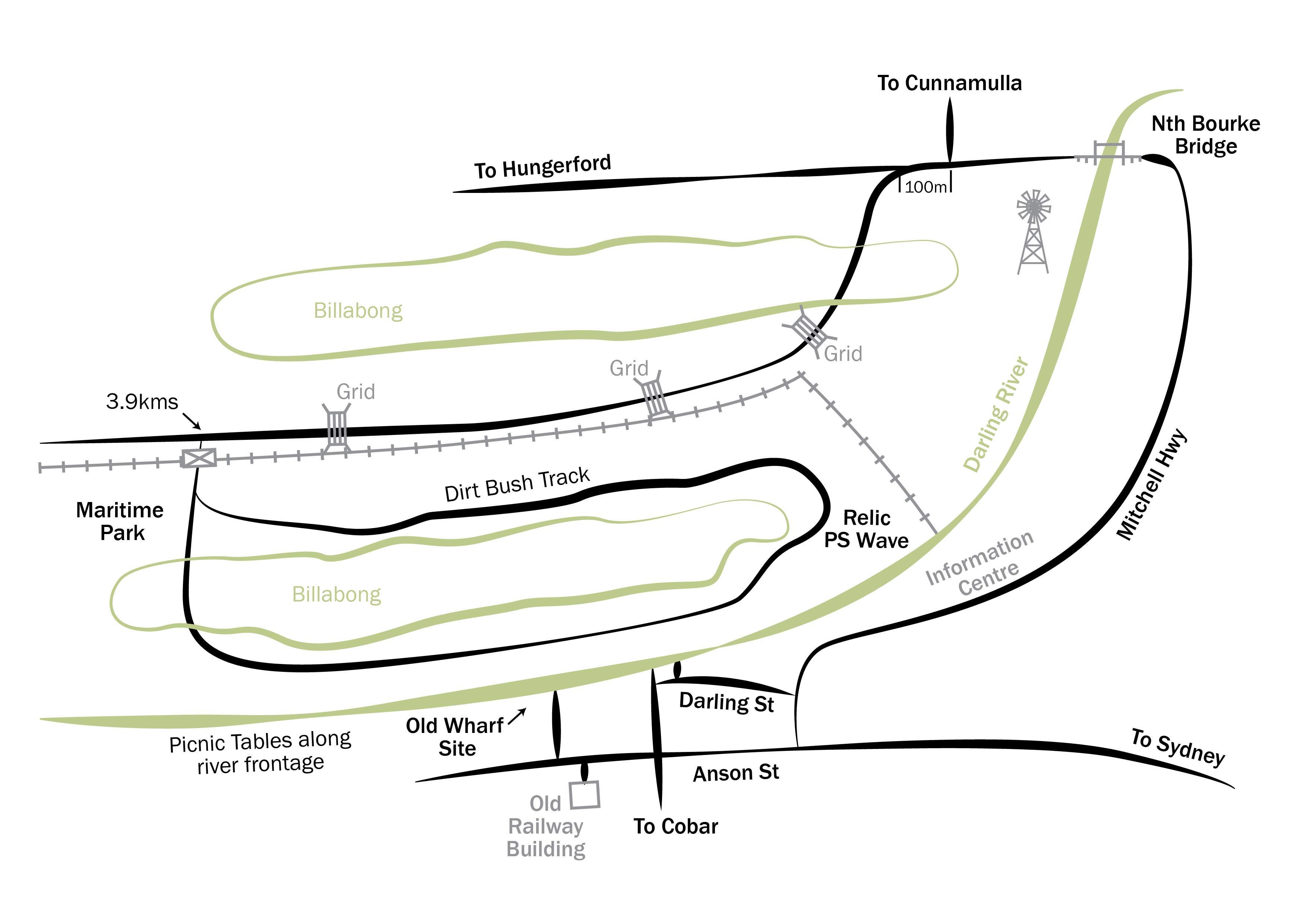 Continue along the track, stopping at all the information signs, which tell the stories of the wharves of the Port of Bourke, the shearers, the paddle steamers, the Ngemba Tribe, the explorers, the Darling-Baaka River, and the ‘P.S Wave’.